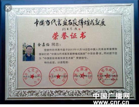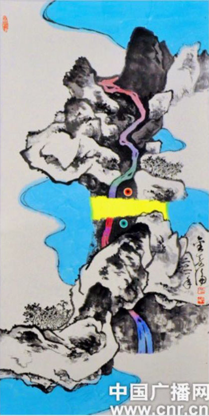 當今之世資訊發達,對古今中外藝術發展概況很易取得有關藝術資料,然後在知己知彼情況之下除了古為今用之外,也應該洋為中用,使傳統書畫在中華文化血脈基礎上不致原地踏步而能邁向嶄新領域!正如司馬遷所說:究天人之際,通古今之變。書畫家應有宏觀的創作心態,掌握天道陰陽變化大原則,不應以習慣成自然的一成不變手法作書畫而不思考突破。圖1是金嘉倫於2011年赴北京參加文化部中外交流中心主辦展覽的山水畫,由中國廣播網所發表圖片。該畫正是他期盼融會貫通中西藝術,而以太極美學創作的山水畫新貌。